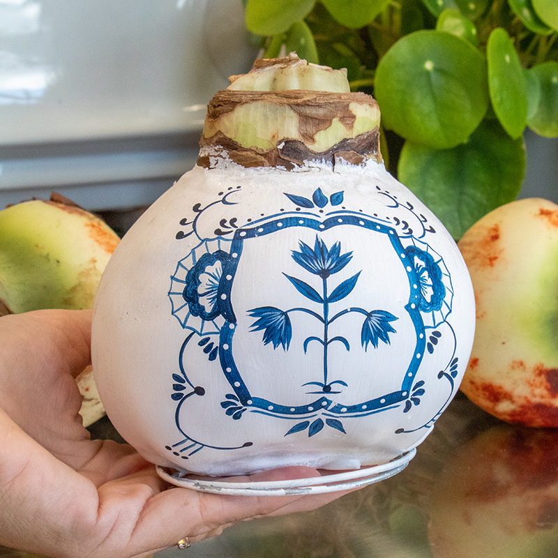Die extra große Amaryllis in Wachs aus der "Delfter Blau" Serie ist etwas ganz Besonderes, die jeden Raum mit Eleganz und Charme erfüllt. Jede Amarylliszwiebel XXL "Delfter Blau Dutch Tile" ist ein echtes Unikat, denn jede Wachsamaryllis ist handbemalt und numeriert! Mit einem außergewöhnlich großen Zwiebelumfang von 38/40 bietet diese Wachsmaryllis im Delfter Blau ein imposantes Erscheinungsbild.