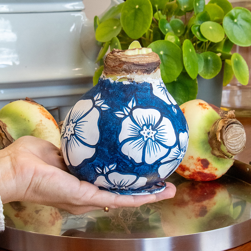 Die extra große Amaryllis in Wachs der "Delfter Blau" Serie ist etwas ganz Besonderes, die jeden Raum mit Eleganz und Charme füllen wird. Jede XXL "Delft Blue Floral Blossom" Wachs-Amaryllis ist wirklich einzigartig, da jede einzelene von ihnen handbemalt und nummeriert wird! Mit einem außergewöhnlich großen Umfang von 38/40 bietet diese Amaryllis in Wachs einen imposanten Anblick.