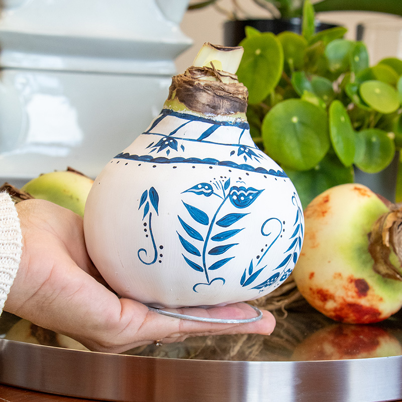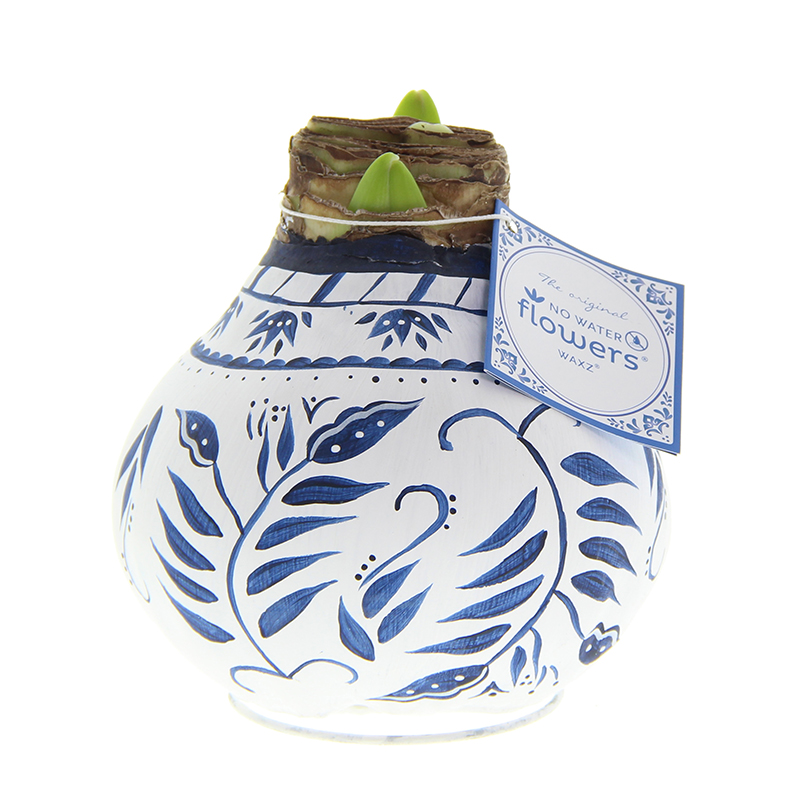 Die extra große Amaryllis in Wachs der "Delft Blue" Serie ist etwas ganz Besonderes, die jeden Raum mit Eleganz und Charme füllen wird. Jede XXL "Delfter Blau Leaf Pattern" Wachs-Amaryllis ist wirklich einzigartig, da jede einzelene von ihnen handbemalt und nummeriert wird! Mit einem außergewöhnlich großen Umfang von 38/40 bietet diese Amaryllis in Wachs im Delfter Blau einen imposanten Anblick.