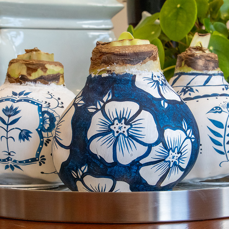Dieses Amaryllis in Wachs Paket "Delfter Blau" besteht aus drei außergewöhnlichen und einzigartigen Wachsamaryllen im berühmten Delfter Blau Design. Dieses Paket umfasst drei unterschiedliche XXL Wachsamaryllen mit einem Umfang von 38/40. Jede einzelen von Ihnen ist handbemalt und nummeriert. Ein echtes Unikat also.