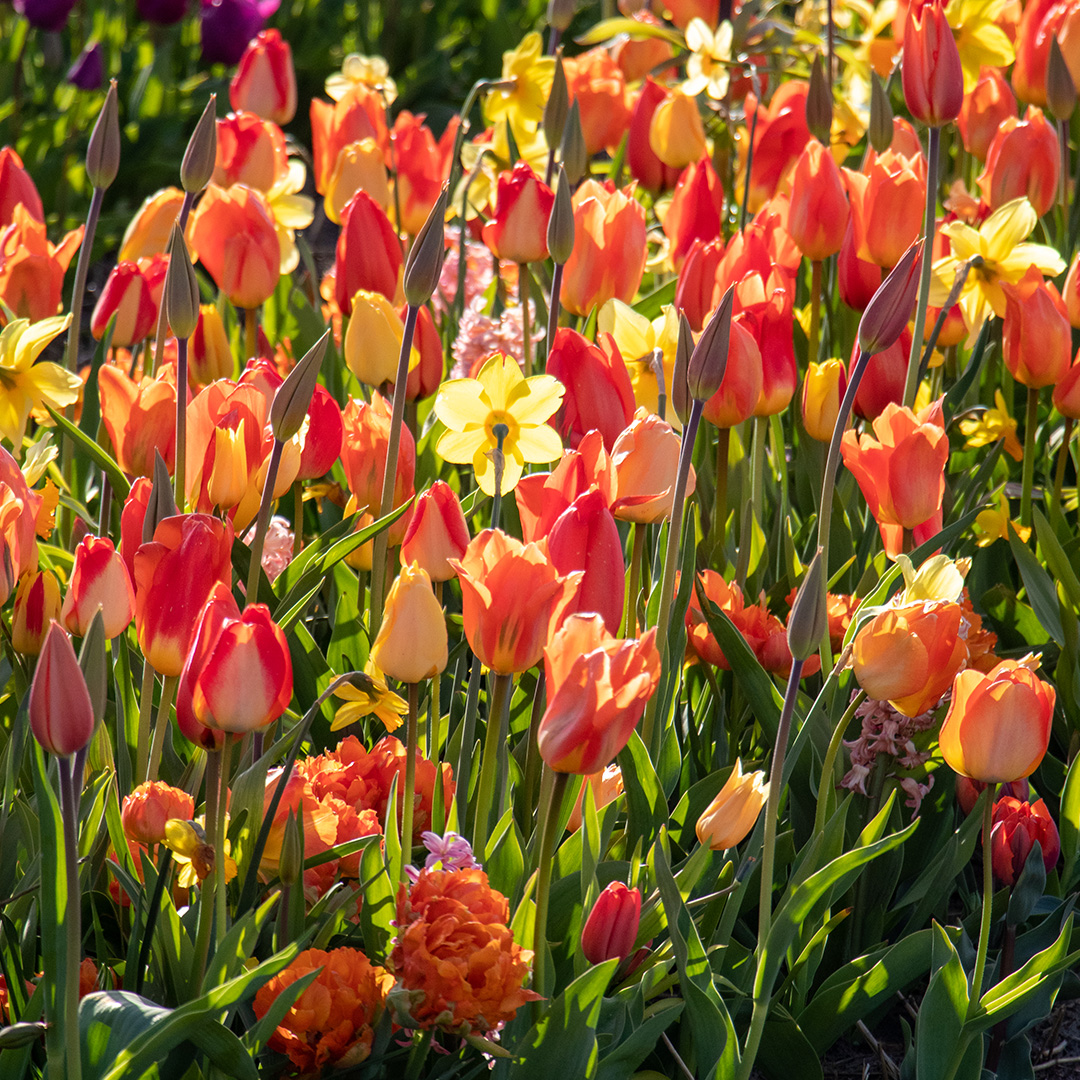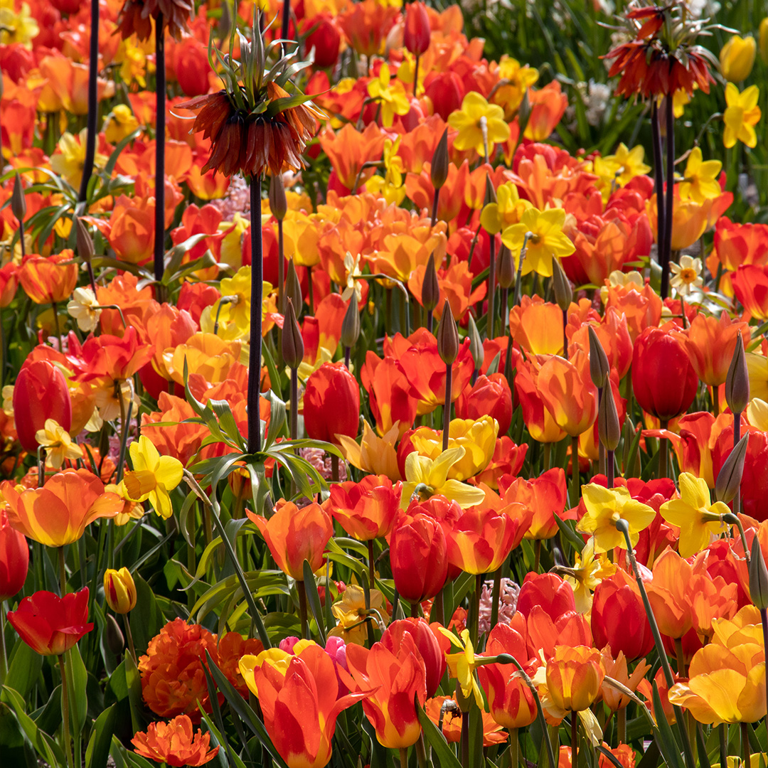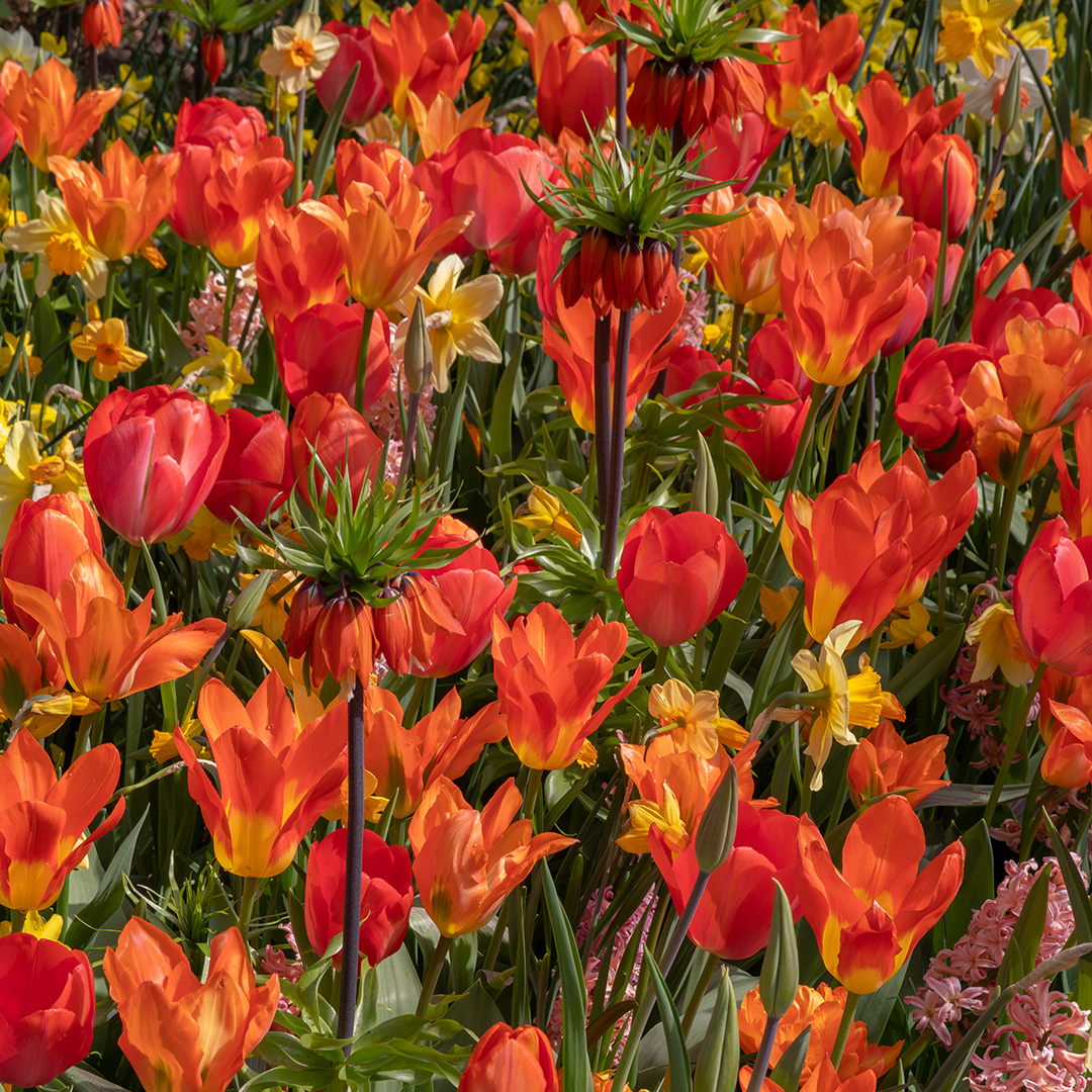 Diese frühblühende Blumenzwiebelmischung "on Fire" ist ein toller Mix aus hauptsächlich Tulpen, aber auch anderen beeindruckenden Frühlingsblühern wie zum Beispiel Narzissen oder Krokussen. Die fröhlichen Farben Rot, Orange, Gelb und das Grün der Blätter geben dieser Frühlingsblüher Mischung eine unglaublich schöne Ausstrahlung. Erfreuen Sie sich an diesem „Feuerteppich“ im Garten.