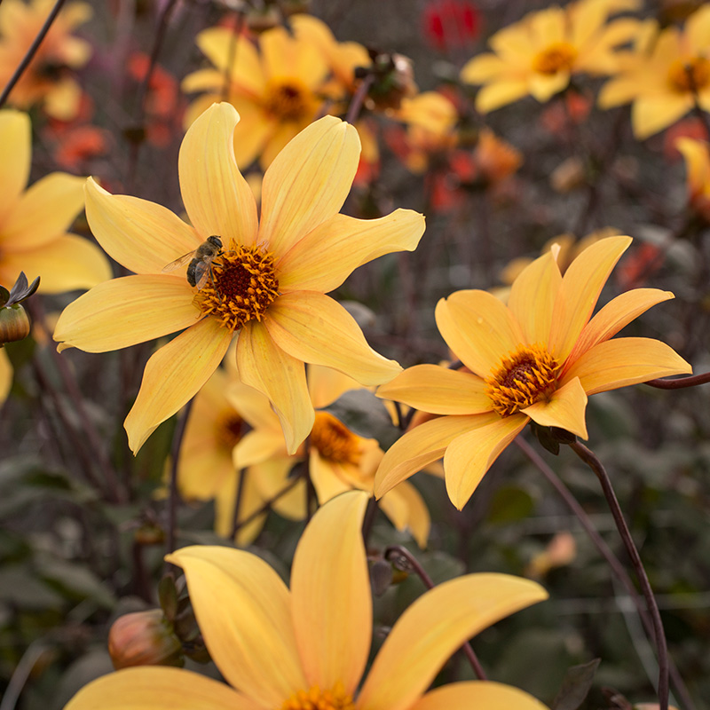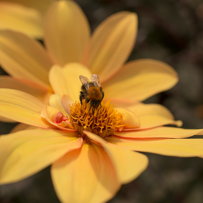 Die Dahlie 'Bishop of York' hat zarte gelbe ungefüllte Blüten. Typisch für die Bishop Dahlien Sorten hat auch diese Dahlie dunkles Laub, das einen tollen Kontrast zu den zarten Blüten bilden. Aufgrund der geringen Wuchshöhe eignet sich diese Bishop Dahlie perfekt um in Töpfen gepflanzt zu werden. Aufgrund des dunklen Laubs kann diese Dahlie auch hervorragend mit verschiedenen Stauden kombiniert werden, ist aber auch schön mit anderen Sommerblühern in gelb oder rot Tönen. Bishop Dahlien blühen vom Frühsommer bis zum Spätherbst reichhaltig und ziehen augrund ihrer weit geöffneten Blüten Bienen und Schmetterlinge an.