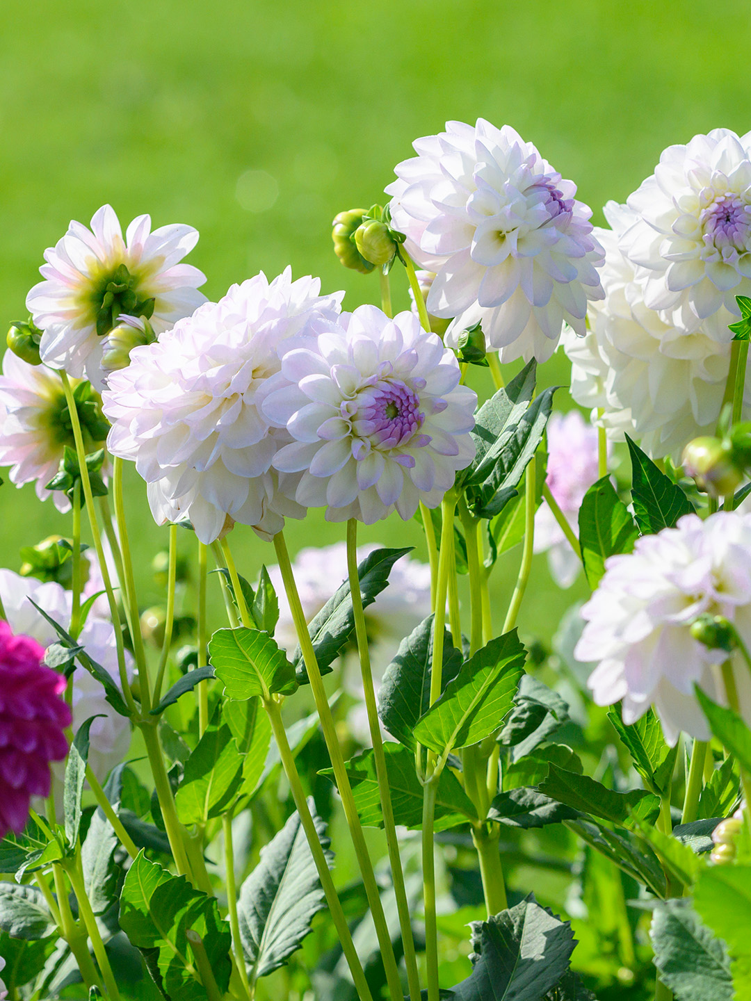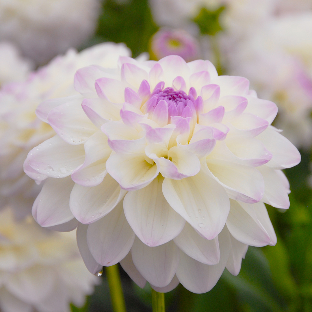 Balldahlien sind sehr beliebt wegen ihrer fantastischen, perfekt gerundeten Blüten an kräftigen Stielen. Besonders die Dahlie Eveline erfreut sich jedes Jahr wieder großer Beliebtheit aufgrund ihrer schönen weißen Ballblüte mit einem kleinen zarten Fliederherzen im inneren der Blüte. Die Dahlie Eveline gibt jedes Jahr schöne kugelförmige Blüten, wenn Sie die Dahlienknollen im Winter frostfrei, kühl und trocken aufbewahrt haben. Balldahlien sind zuverlässige Lieferanten von symmetrischen Blumen in Ihrem Garten. Die Dahlienknolle Eveline wiird etwa 100 cm hoch und blüht ununterbrochen vom Sommer bis hin zum ersten Frost. Sie gibt so viele Blumen, dass Sie problemlos auch viele davon als Schnittblumen in einer Vase in Ihrem Haus platzieren können.