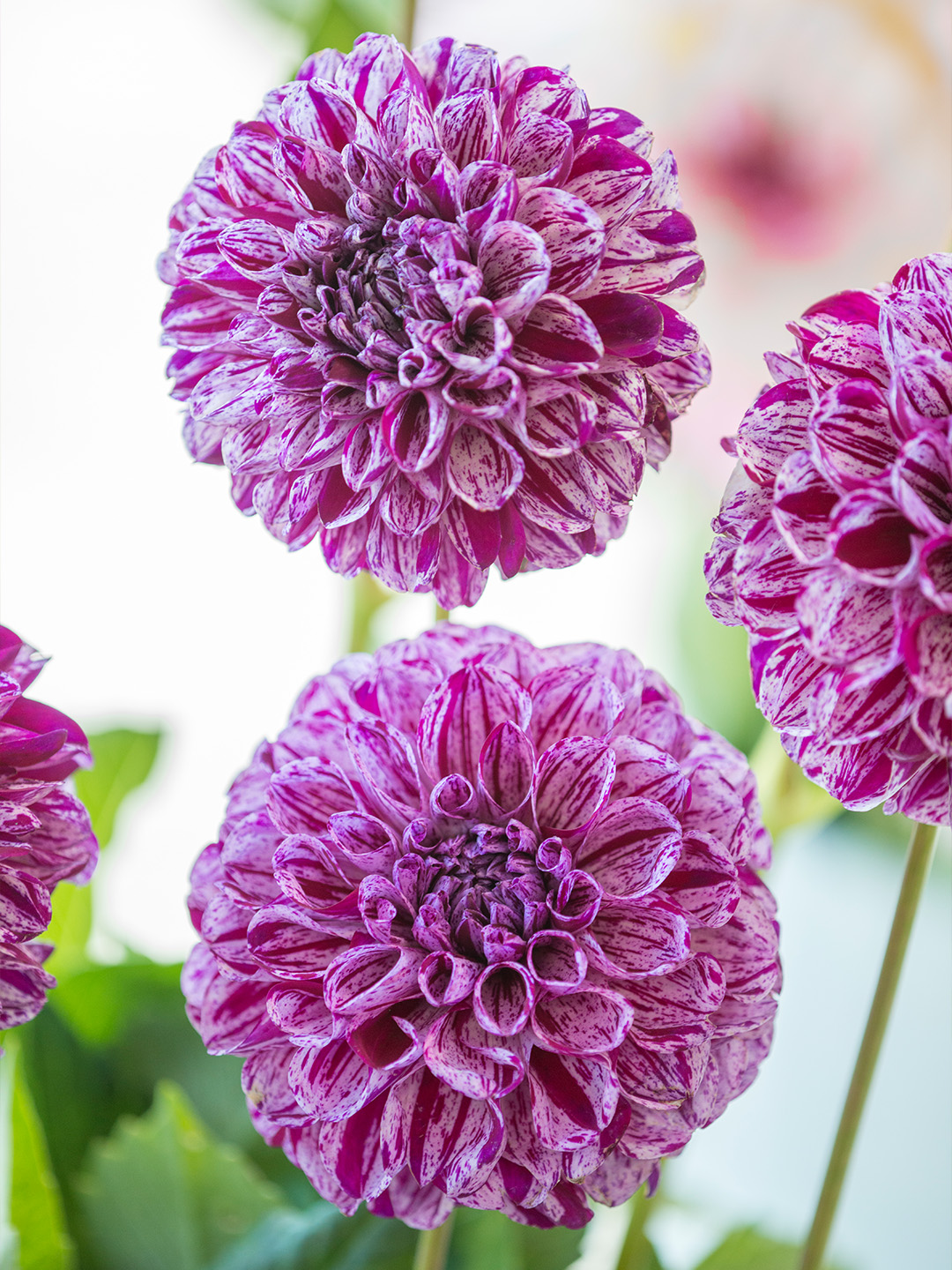 Die Balldahlie Marble Ball ist in ihrer Blütenzeichnung einzigartig. Ihre Blütenbälle haben die Grundfarbe weiß und sind versehen mit vielen violetten Spritzern und dünnen Streifen. Diese Dahlie, die zur Sorte der Balldahlien gehört, ist ein bemerkenswerter Sommerblüher und wird ihre Blumen von Juli bis Oktober zeigen. Bevorzugt wird ein sonniges Plätzchen. Für einen tollen Effekt in Ihrem Garten empfehlen wir, die Marble Ball in Gruppen beieinander zu setzen. Dahlien wachsen in nährstoffreichen Böden, vertragen aber keinen Frost. Natürlich eignen sich diese Schönheiten hervorragend als Schnittblumen. Füllen Sie Ihr Zuhause mit diesen eindrucksvollen Blühern, die Sie immer anlächeln werden.