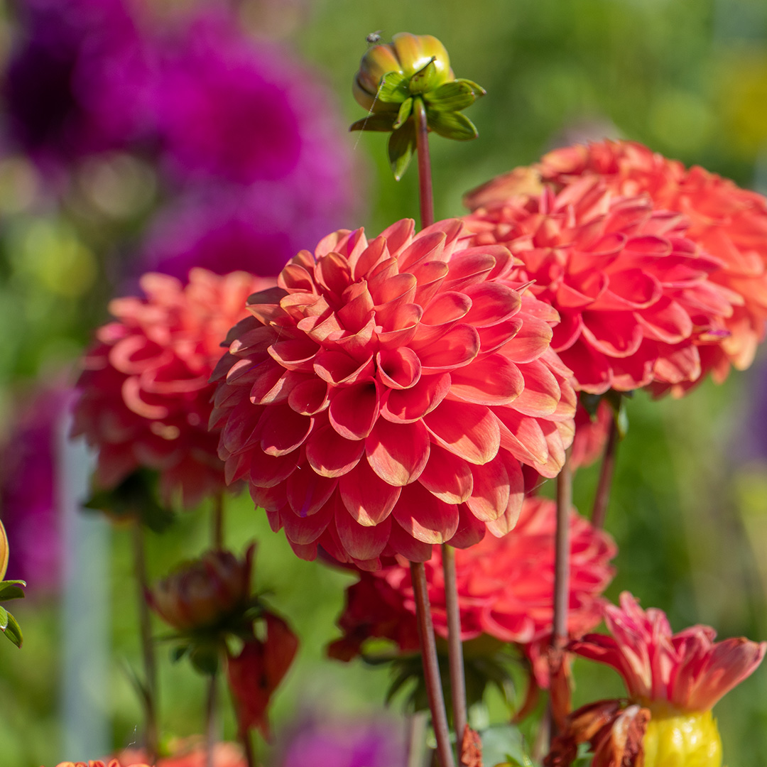 Dank ihrer kräftigen Stiele ist diese Dahlie nicht nur ein Blickfang im Garten, sondern eignet sich auch ideal als Schnittblume für Sträuße. Kombinieren Sie sie mit sanften Pastelltönen oder anderen warmen Farben für einen kraftvollen Kontrast.