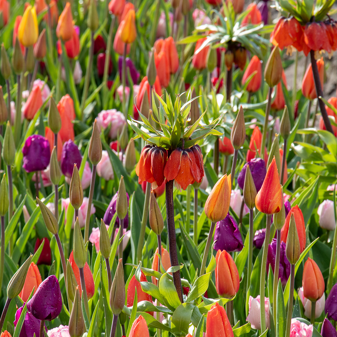 Diese wunderschöne Mischung aus Tulpen und Kaiserkronen vereint warme Farbtöne wie feuriges Orange, sonniges Gelb, tiefes Rot sowie zarte Rosa- und Violetttöne. Das Ergebnis ist eine lebendige Farbpalette, die vom frühen Frühling bis weit in die Blütezeit hinein ein spektakuläres Blütenmeer bietet.