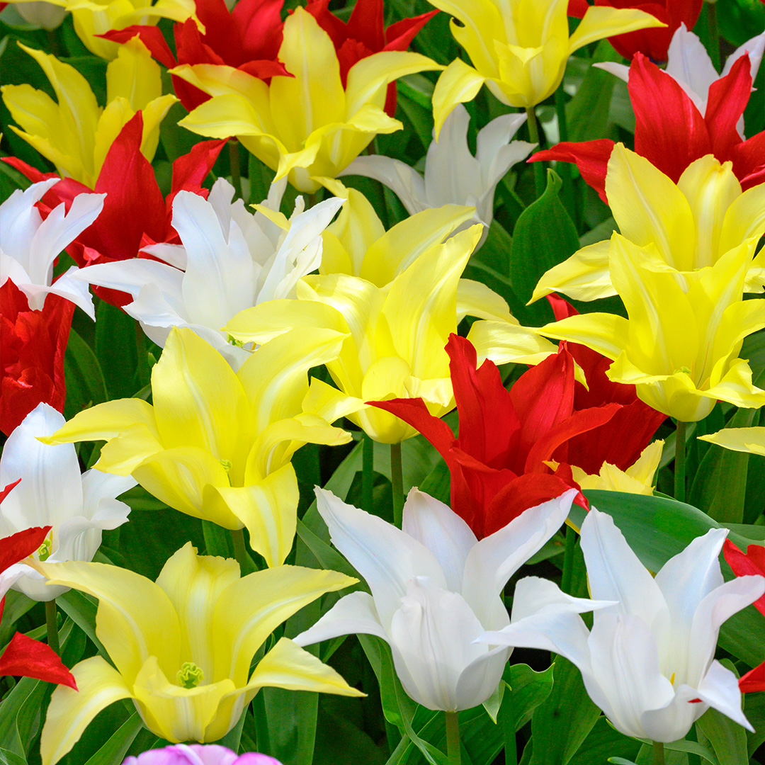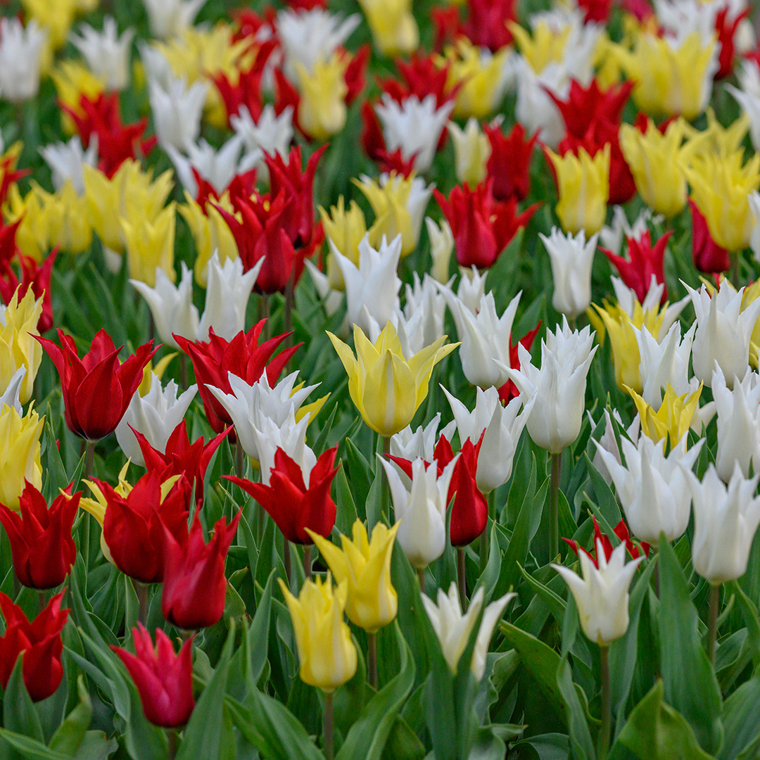 Die Basis dieser großartigen Mischung bilden die anmutigen lilienblütigen Tulpen, eine Auswahl an Top-Sorten, die für ihre eleganten, schlanken Blütenblätter bekannt sind, welche sich graziös nach außen neigen. 'Très Chic Festival' umfasst spezifisch die wunderschönen Sorten 'Tres Chic', 'Florijn Chic' und 'Isaac Chic'. Zusammen erzeugen diese Tulpen eine atemberaubende Palette aus raffinierten Farbtönen von Gelb, Rot und Weiß, die perfekt harmonieren und ein Gefühl von heiterem Luxus ausstrahlen. Mit einer typischen Höhe von 40-60 cm fügen sie Ihrem Beet eine wunderschöne Schichtung hinzu.